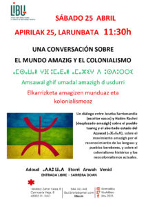 Un diálogo entre Joseba Sarrionandia (escritor vasco) y Hakim Rachni (desplazado amazigh) sobre el pueblo tuareg y el abortado estado del Azawad (ⴰⵣⴰⵓⴰⴷ), sobre el movimiento amazigh por el reconocimiento de las lenguas y pueblos bereberes, y sobre el colonialismo histórico y los neocolonialismos actuales. (La conversación se desarrollará en español)